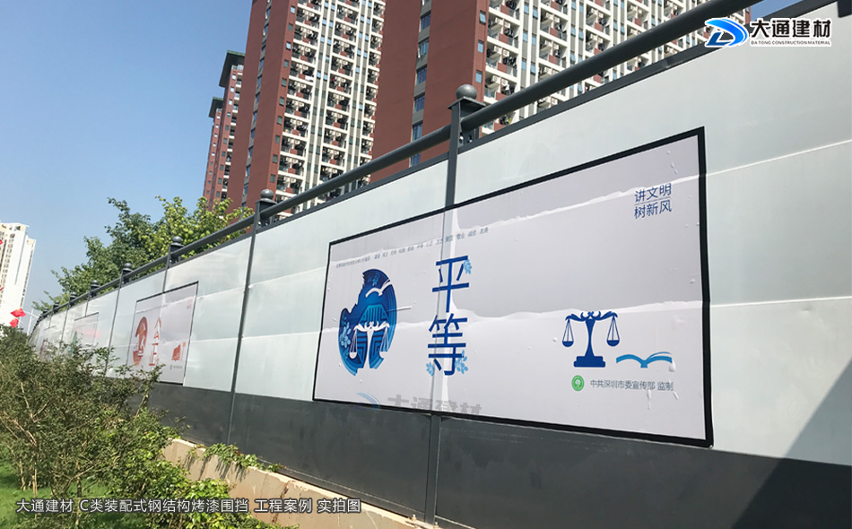 深圳市大通建材有限公司專業生產烤漆鋼圍擋源頭廠家,大通烤漆鋼圍擋C款符合深圳市標準是一款新型裝配式圍擋,拆裝方便、美觀大氣、綠色環保、安全穩固,在施工時可以起到了一定的隔離危險,安全防護作用,已廣泛應于深圳各區域的工程施工項目。