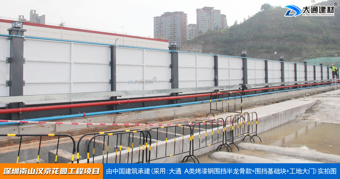 建設工程施工工地四周應按規定設置連續、密閉的鋼結構施工圍擋,建造多層、高層建筑的還應設置安全防護設施。在市區主要路段和市容景觀道路及市場、機場、碼頭、車站廣場等人流量、車流量比較多的地方設置的施工圍擋的高度不得低于2.5m,在其它路段設置的圍擋的高度不得低于1.8m。而深圳市大通建材A類鋼圍擋烤漆半/無龍骨款的標準高度是2.5米、長度為6.3米一擋,而圍擋高度特殊需求的如3/米/4/米/5米/6/米等高度的可以進行定制化生產。